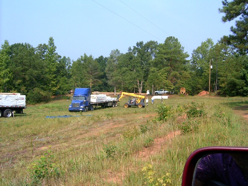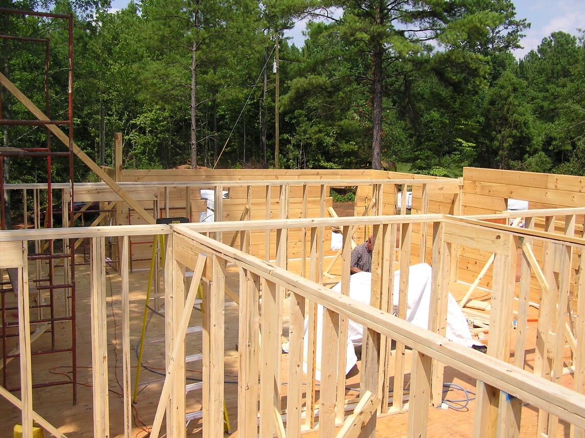 Here is one my Uncle took sitting on top of the outside wall of the Great Room after we hung all the rafters. |